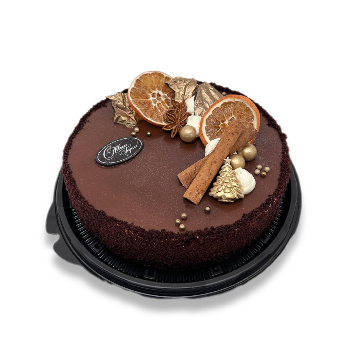 Шоколадно-маслянный бисквит, шоколадный крем со вкусом лесного ореха. Оформлен шоколадной зеркальной глазурью и какао.