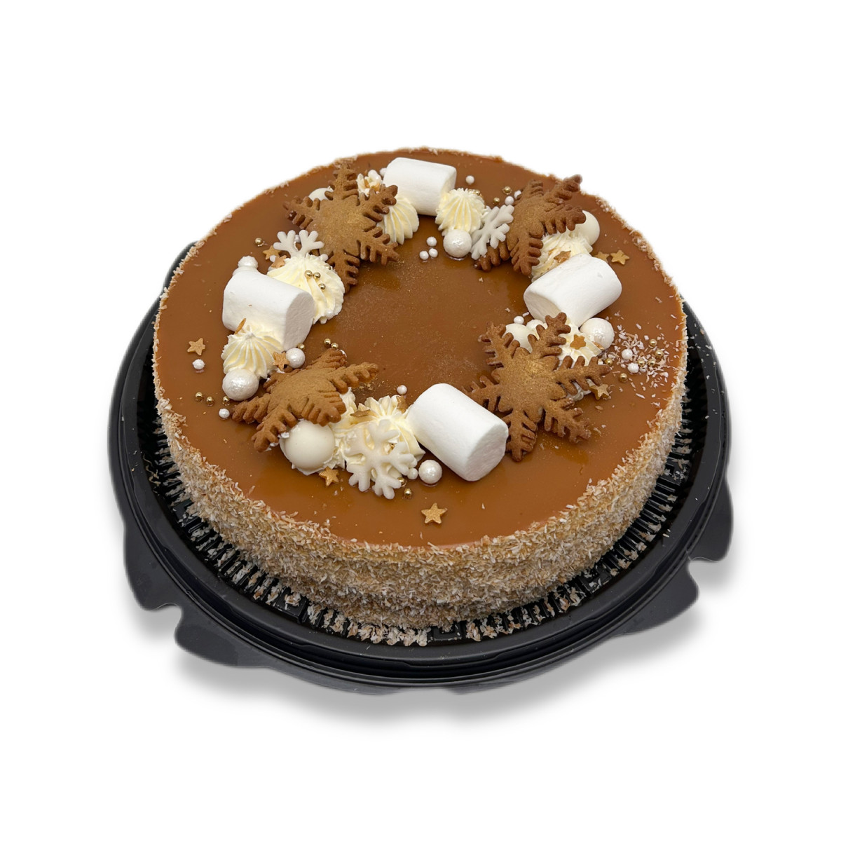Классический ванильный бисквит, карамельно-сырный крем. Оформлен карамельной глазурью, шоколадным ганашем и обжаренной кокосовой стружкой.