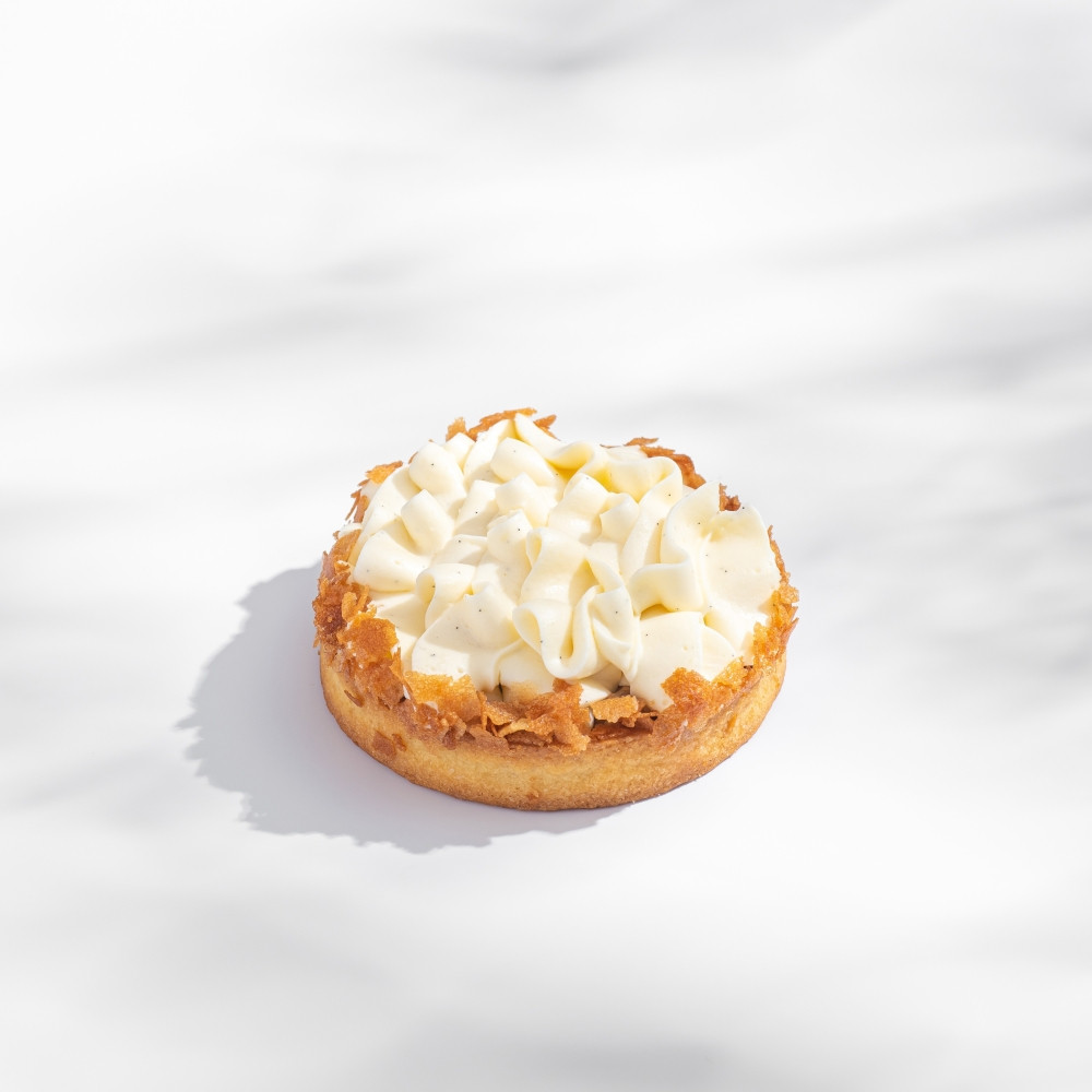Песочная основа, хрустящий слой с жаренным миндалем и пралине, ароматный бисквит дакуаз с минда, миндальный ганаш и взбитый ванильный ганаш, вафельная крошка