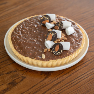 Песочное тесто, наполненное нугой с арахисом, тягучей карамельь и молочным шоколадом с арахисом